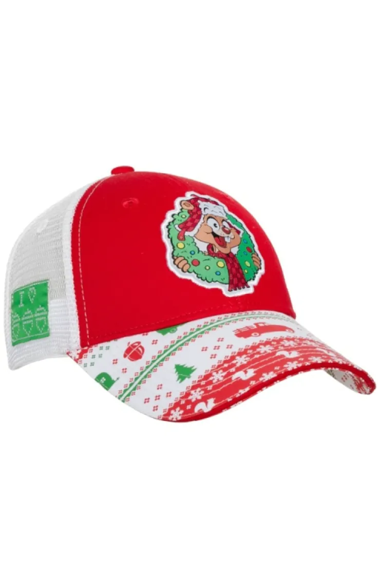 Universal Studios trucker cap featuring Earl the Squirrel with a holiday wreath on a festive fair isle pattern with red accents.