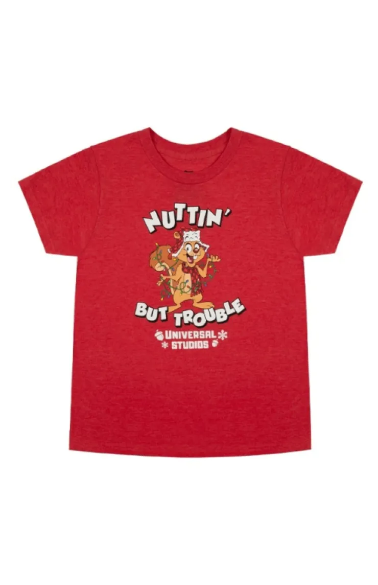 Universal Studios adult t-shirt in the color red featuring Earl the Squirrel with "Nuttin’ But Trouble" across the front.