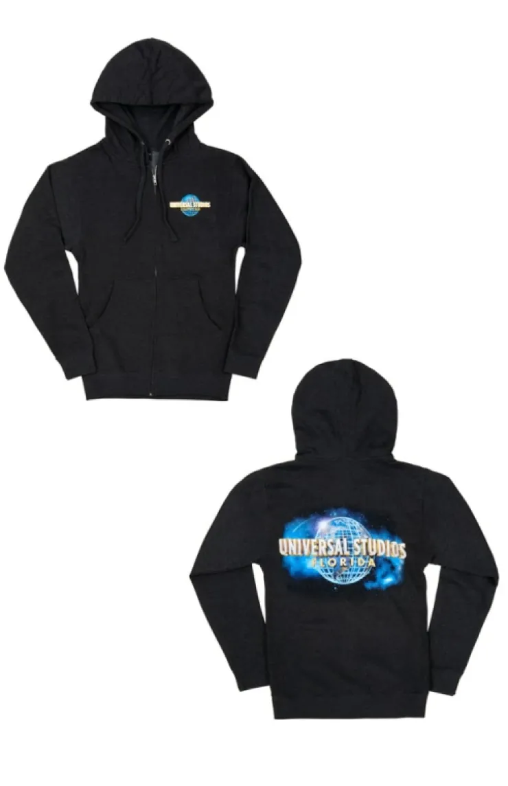 Commemorative, adult zip-up hooded sweatshirt featuring the iconic "Universal Studios Orlando Resort" logo over a striking cosmic background on the back, and matching logo on the front. Design is screen printed on comfortable, charcoal grey garment.