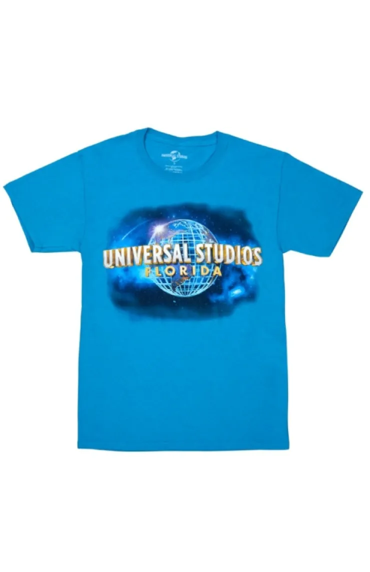 Vibrant adult t-shirt featuring the iconic "Universal Studios Orlando Resort" logo over a striking cosmic background. Design is screen printed on soft, turquoise blue garment.