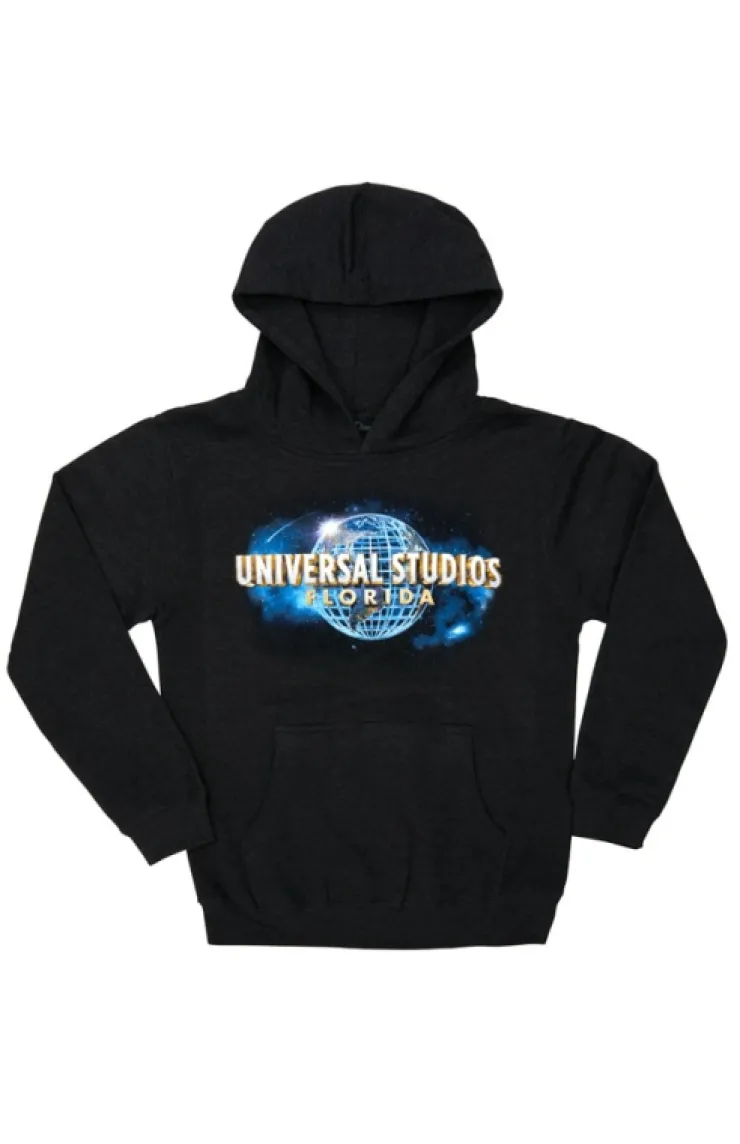 Commemorative, youth pullover hooded sweatshirt featuring the iconic "Universal Studios Florida" logo over a striking cosmic background on the front. Design is screen printed on comfortable, charcoal grey garment.