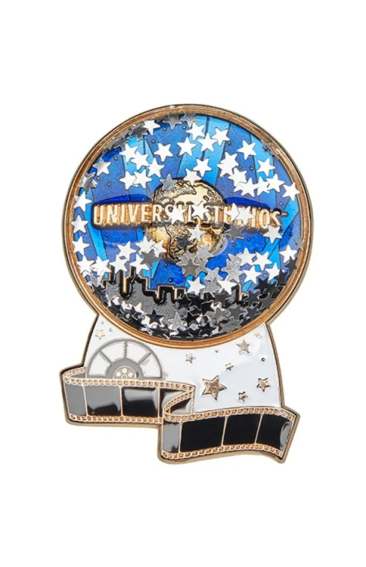 Commemorative Universal Studios pin with a glitter globe feature and filmstrip framing along the bottom.