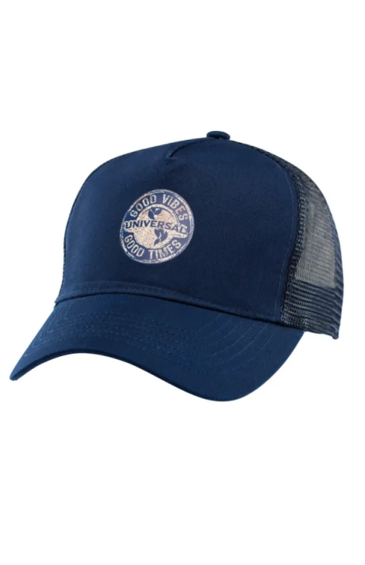 "Good vibes, good times" at Universal Studios! This navy-blue trucker-style hat is made from 50% recycled plastic. The snap back adjustable closure makes it so one size fits most adults for a comfortable fit.