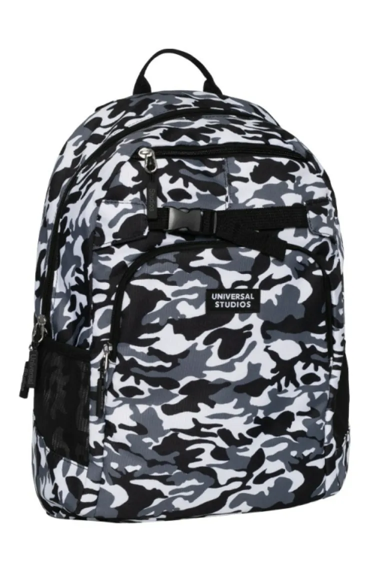 Universal Studios black & white camo backpack featuring an embroidered "Universal Studios" logo patch on the front.