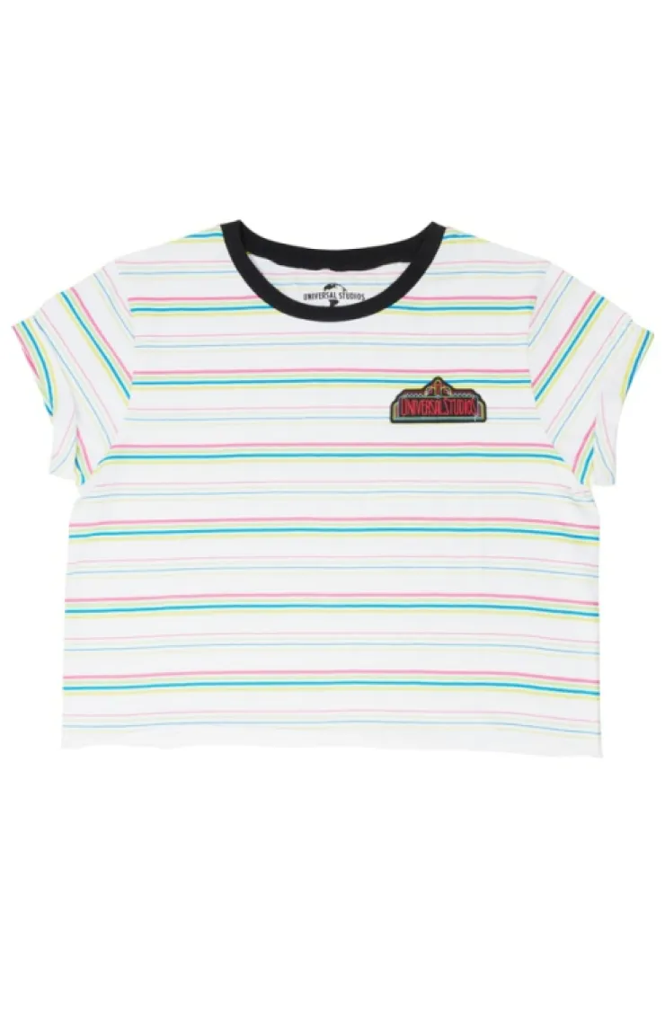Relive your first trip to Universal Studios as we throw back to our roots with this vintage ladies crop t-shirt featuring our retro "Universal Studios Florida" marquee logo. Design is appliquéd on a lightweight, cropped shirt body with vibrant stripes, hemmed sleeves, and black trim neckline.
