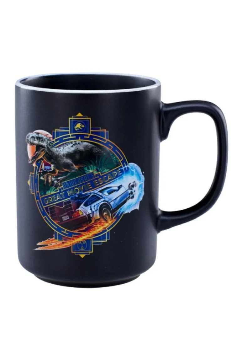 Before you take on the challenge of "Universal's Great Movie Escape" sit back, relax, and enjoy a cup of your favorite hot beverage. Design features images from the two iconic films the escape rooms are themed after, Jurassic World, and Back to the Future. Matte black finish of the mug is contrasted by a white rim.