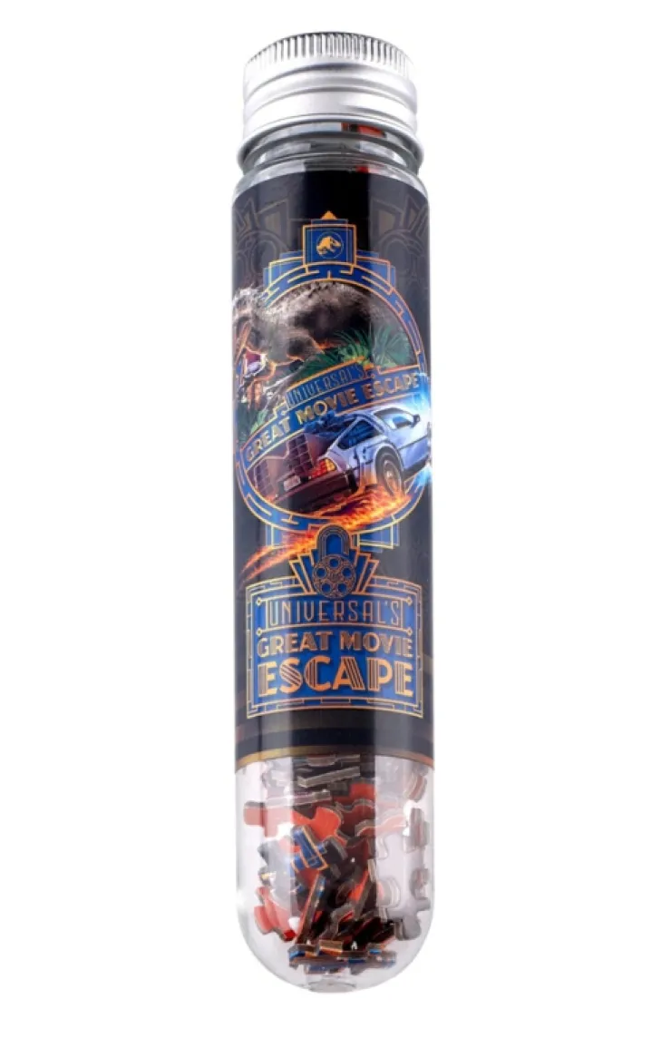 After experiencing "Universal's Great Movie Escape", you can further test your brain power with this micro puzzle that features images from the two iconic films the escape rooms are themed after, Jurassic World, and Back to the Future. 150 cardboard pieces come in a test tube with a twist off cap.