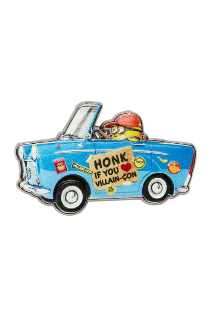 Join the Minions on their trip to the infamous Villain-Con! Silver-tone pin contains two tacks with pliable star shaped pin backing to ensure the pin stays secure during your adventures.