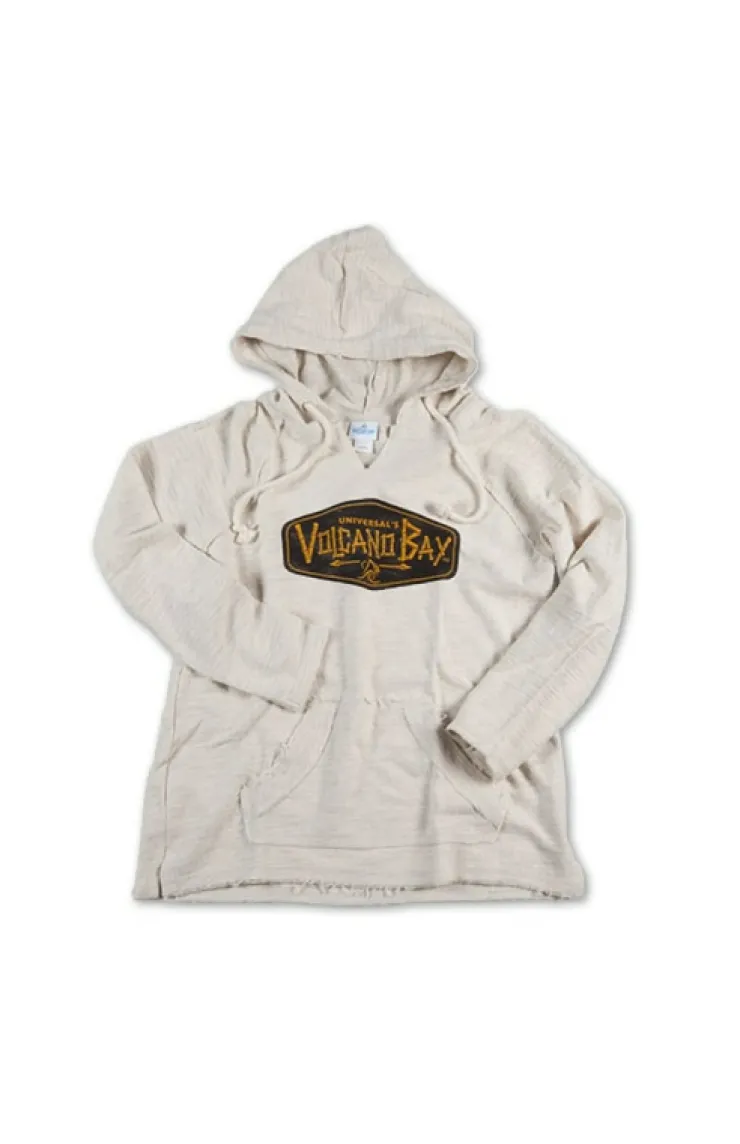 Get comfy in an easy-going pull-over hoodie with tiki Volcano Bay logo in bamboo lettering. Lightweight fabric has baja styling.