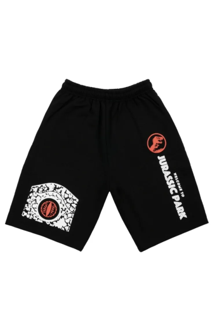Jurassic Park black adult shorts featuring "Welcome to Jurassic Park" on the front with red dinosaur accents.1…