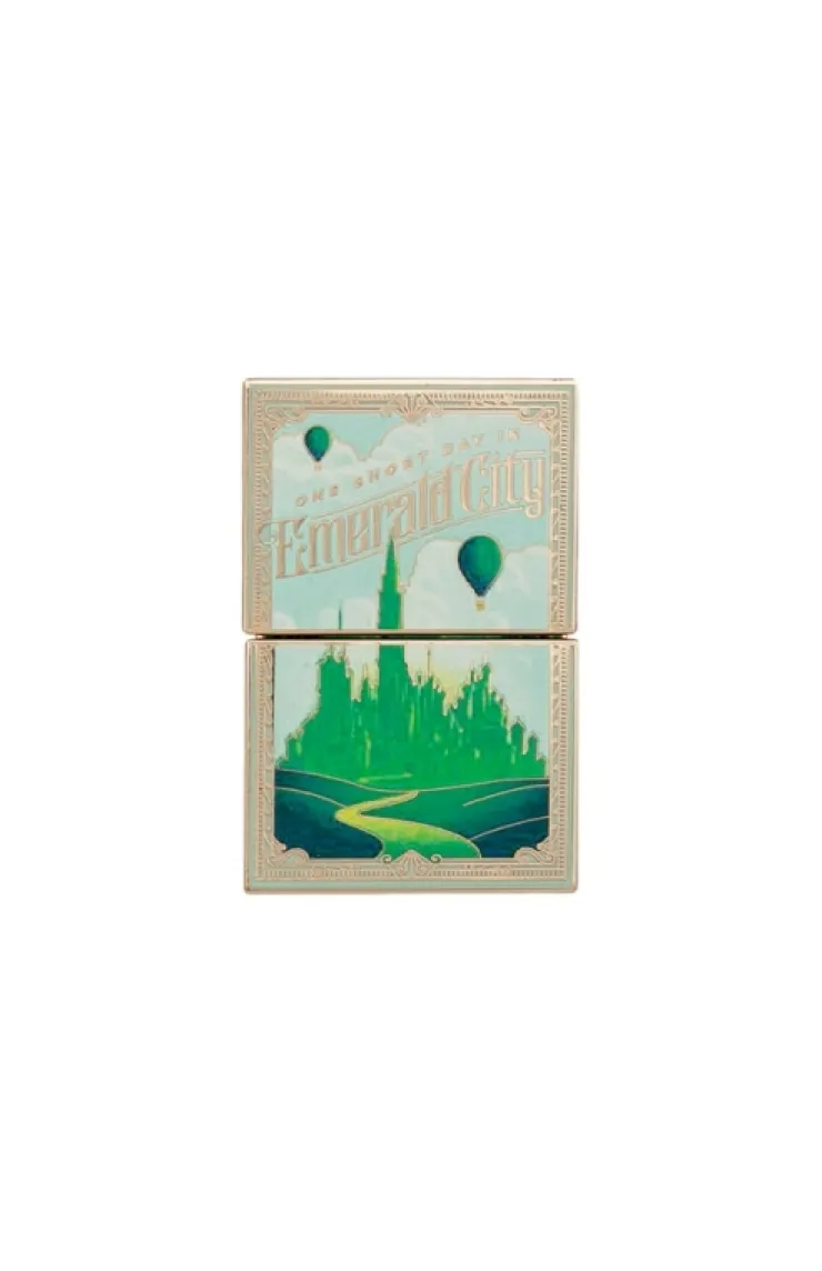 Wicked slider pin featuring a beautiful graphic of the Emerald City and slides open to reveal the Wizard.