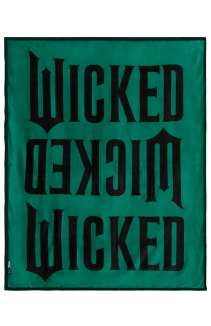 Wicked plush blanket in the colors green & black featuring the Wicked "W" emblem on the front and the "Wicked" logo repeated three times down the back